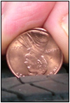 Another way to measure tread depth is the old penny test. Here you hold a penny in the tread with Lincoln's head toward the center. If all of old Abe's head can be seen, the tread is 2/32" or less.